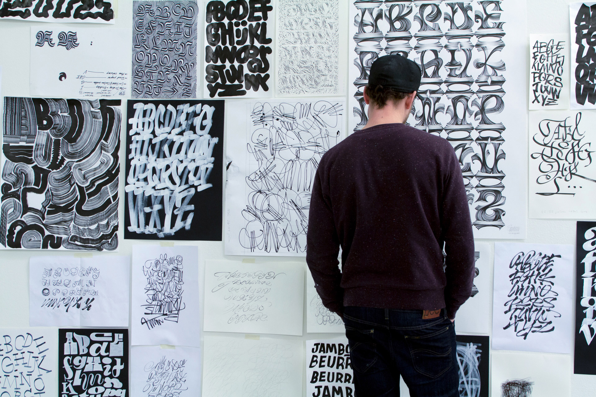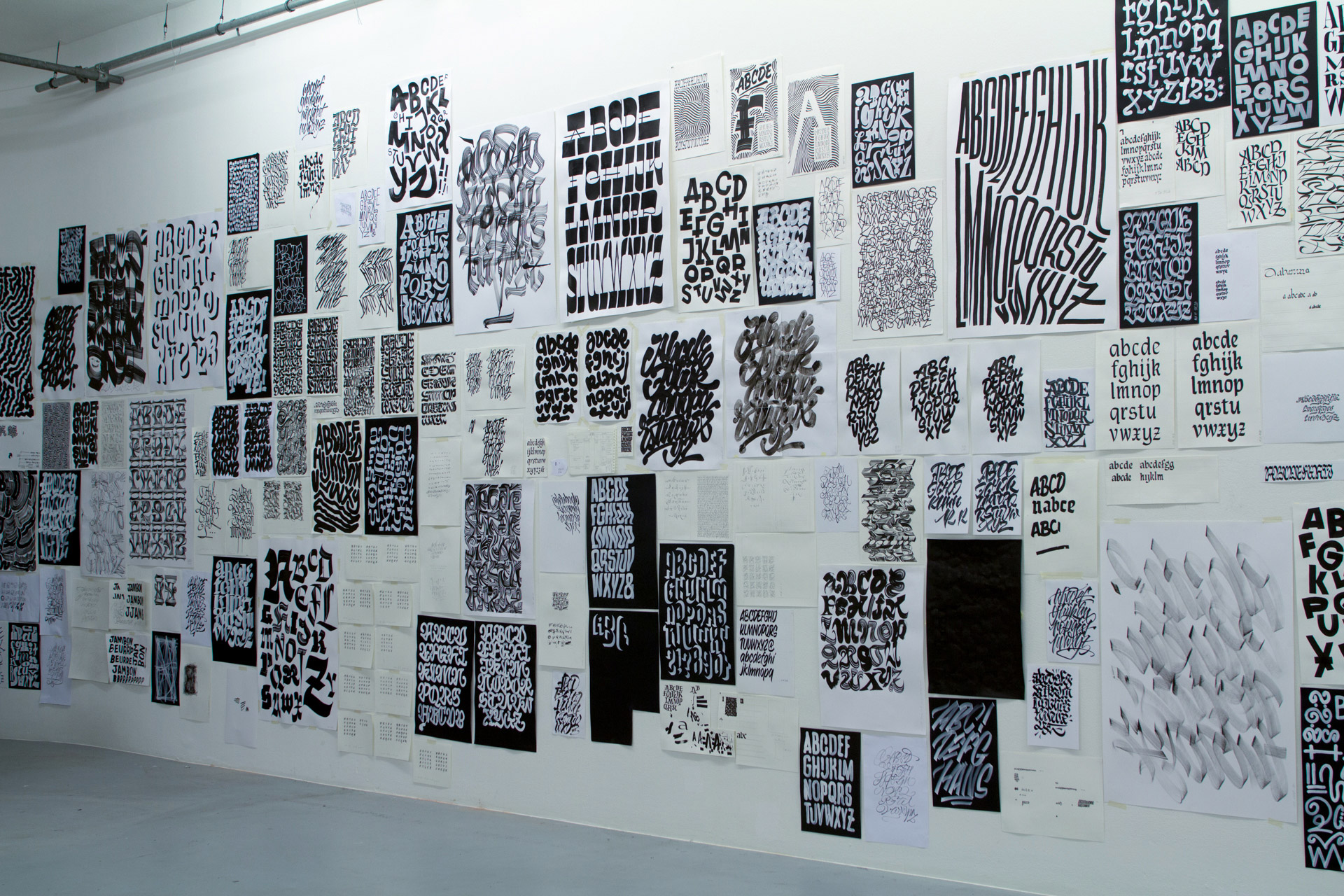 The alphabet is, of course, an (perhaps the most) important guideline for our expression. Under certain conditions, it shapes our voices, thereby creating the possibility of adding meaning on top of the semantic. These rules, behaviours, and agreements are all matters that need to be explored. From time to time, The collective devotes themselves to entirely to redefine boundaries of what a latin alphabet can be. In a short time in the gallery, High on Type will create as many alphabets as possible through a variety of challenges. The result is something that goes beyond a study of form. Questioning the tools we have as human beings to create meaning is essential in a world that exists largely by the virtue of communication. Celebrating the alphabet is a symbol of the possibilities of expression.