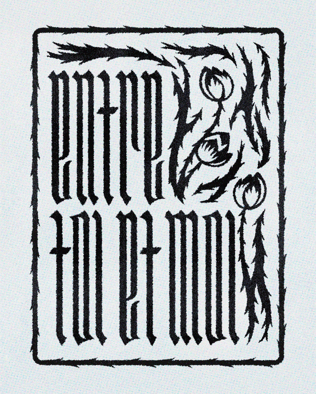 Initié en 2012 au sein de l’École des Arts Décoratifs de Strasbourg (aujourd’hui HEAR) puis à l’Atelier national de recherche typographique à Nancy, ce projet de recherche développe un langage plastique où textes et images se mêlent. La douceur de motifs végétaux y côtoie la géométrie tranchante de caractères gothiques, empruntés à l’imagerie heavy metal. Le contraste entre la dureté et la souplesse évoque la porosité des zones frontalières, où les altérités se frôlent et s’hybrident.