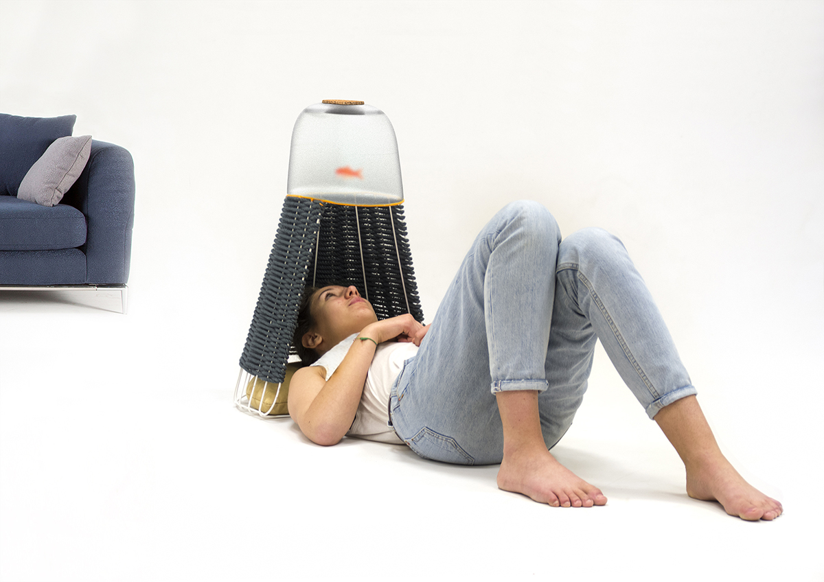 En nous invitant à de nouvelles expériences ou de nouveaux usages, les projets de Nicolas Granger nous incitent à changer de point de vue. C’est le cas de son aquarium Submersio qui tout en nous proposant une vue alternative des poissons (par en-dessous), nous immerge dans un univers sub-aquative propice à la détente.